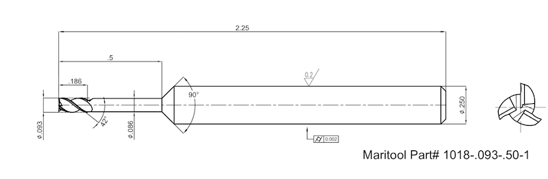 .093 dia 3 Flute Square Necked End Mill With .50 Reach