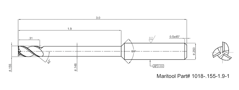 .155 dia 3 Flute Square Necked End Mill With 1.9 Reach