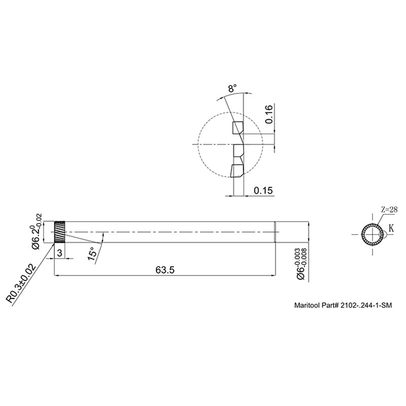 28 Flute PCD Tipped End Mill .244 dia x 3mm flute length