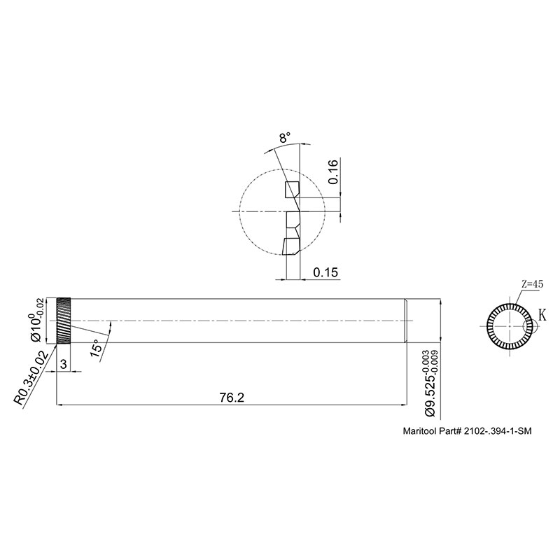 45 Flute PCD Tipped End Mill .394 dia x 3mm flute length With .375 Carbide Shank