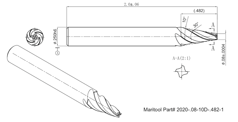 .250 Shank 10deg per side 4 Flute Square End Mill With .482 loc TiAlN Coated