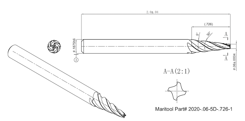 .1875 Shank 5deg per side 4 Flute Square End Mill With .726 loc TiAlN Coated